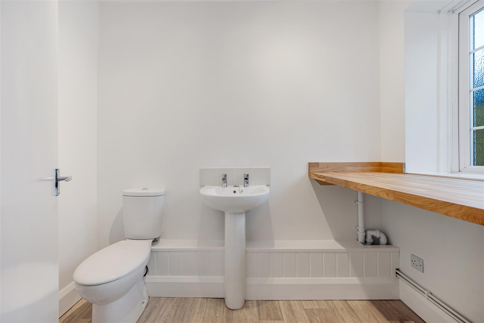 The open-plan dining kitchen provides an attractive heart of the home, featuring ample workspace and a practical, well-balanced layout. The kitchen is equipped with a cooker and generous storage, whilst the large window frames views to the rear, with good space for a sizeable dining table. From the kitchen, a corridor leads to the rear entrance and separate utility room with plumbing for laundry facilities, WC and ample countertop.
