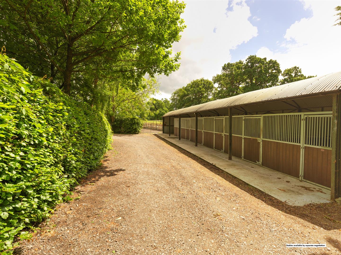Off the drive and parking sweep there is an open fronted Dutch barn with six internal stables and a hay store to one end. The stables have been professionally installed (Tailored Equine Stables) with swing doors and half-filled sides with high quality wood effect plastic tongue and groove panels and galvanised steel bars to their tops. The stables are set on a concrete pad and have power and water connected.