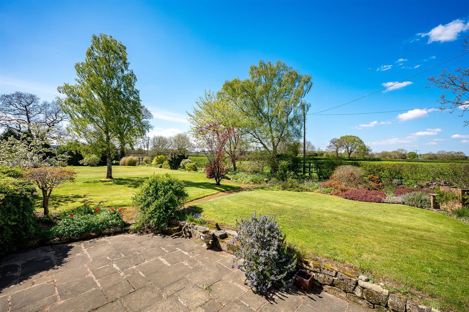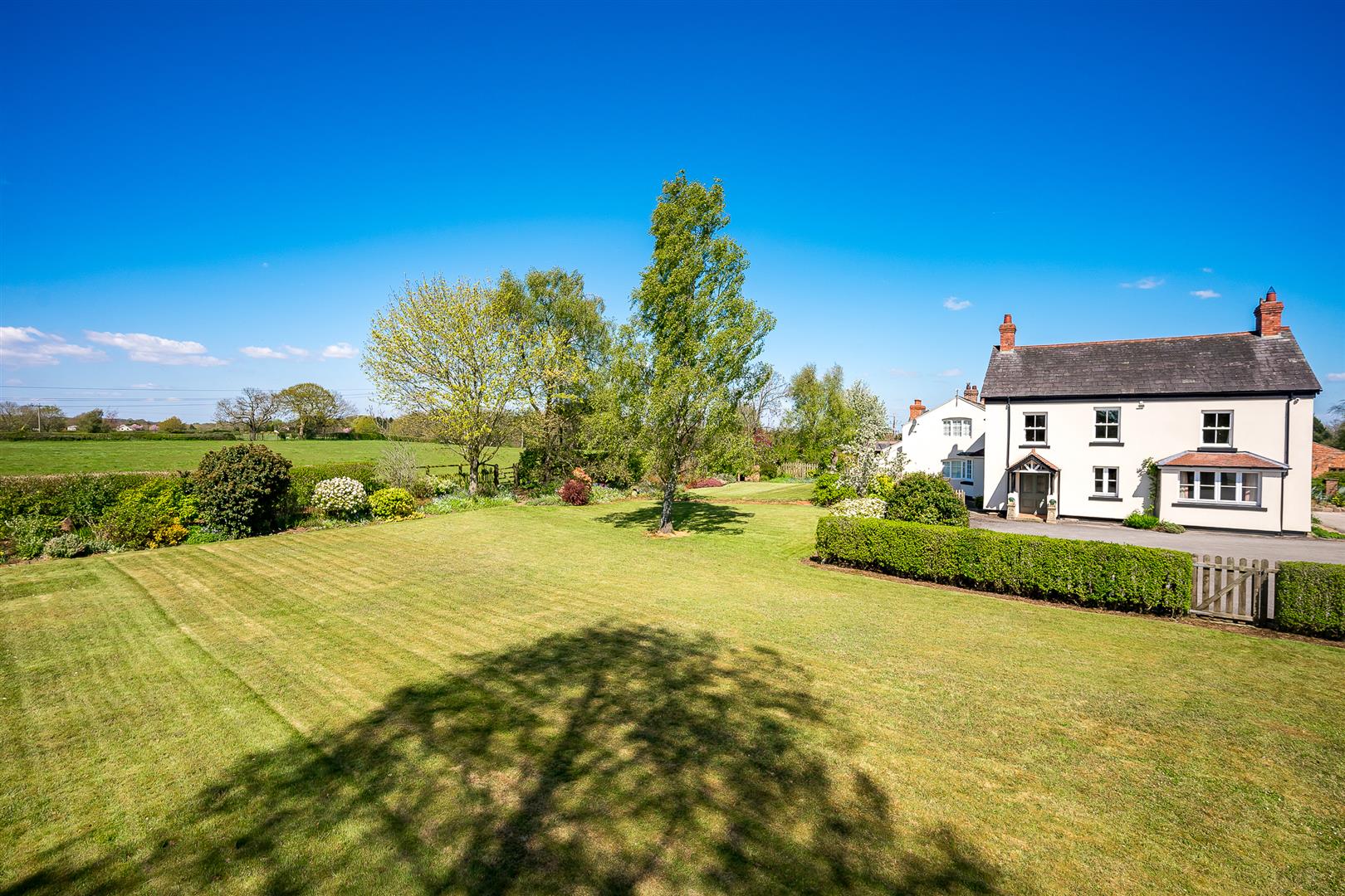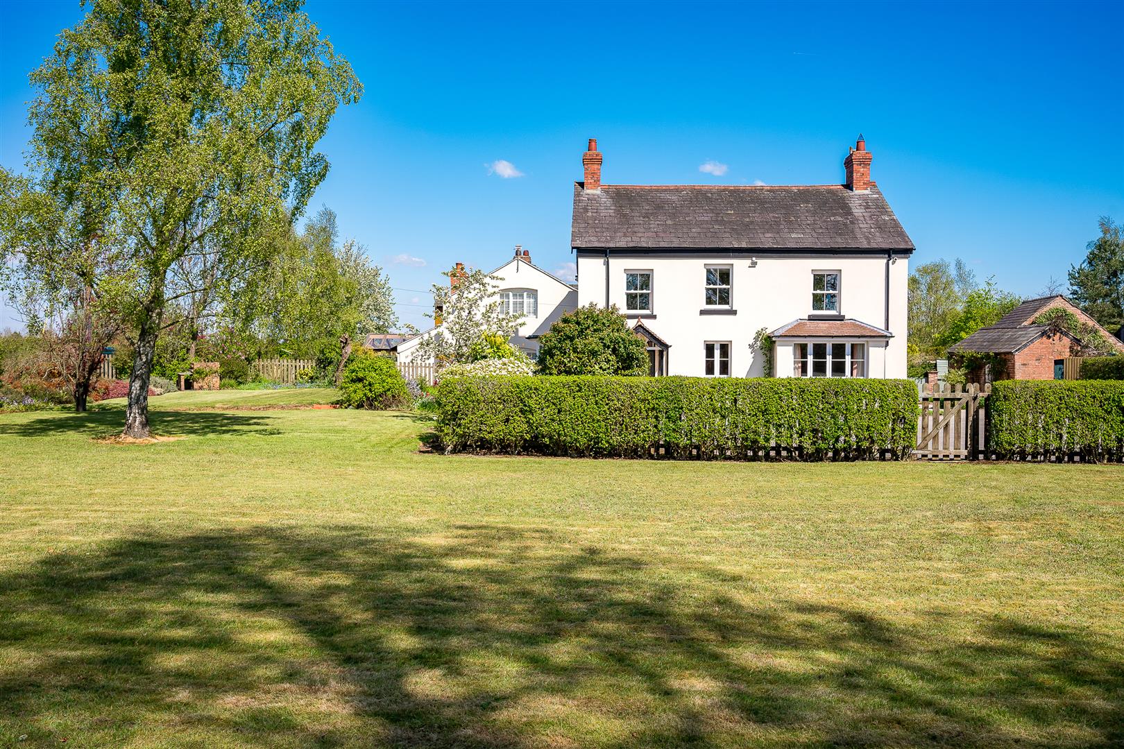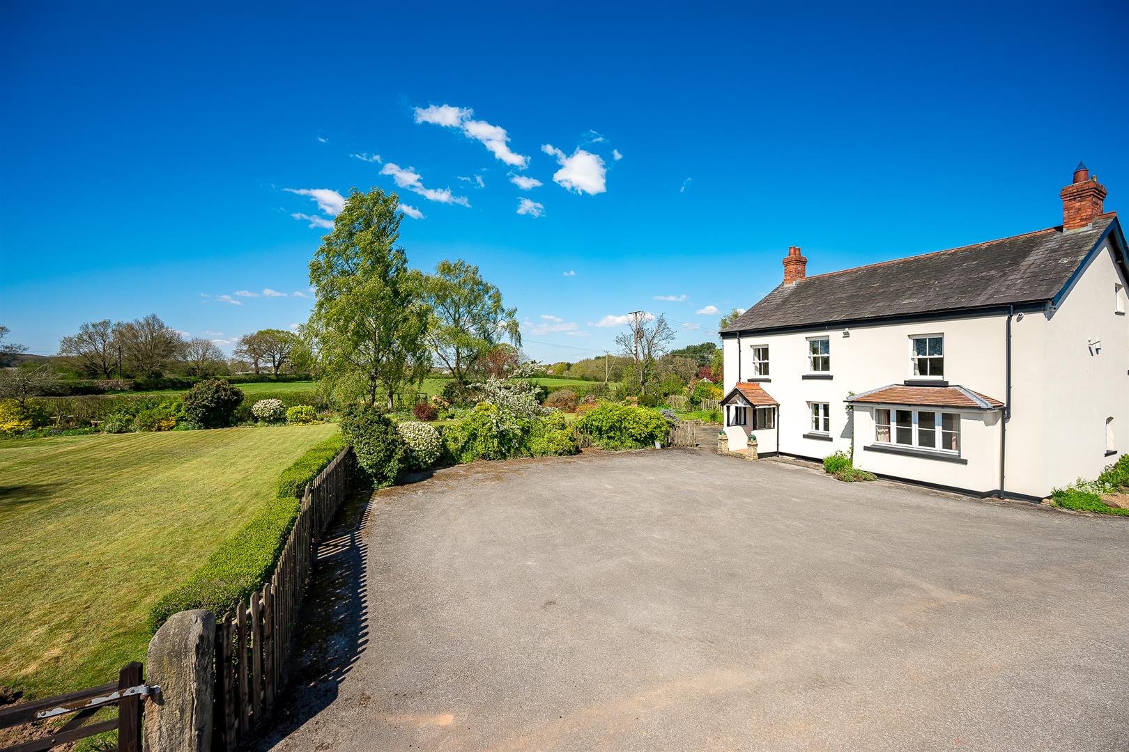 The gardens are a delight and a real feature of the house, being southwest facing, they wrap around the front and side elevations and consist of large expanses of manicured lawns punctured by mature specimen trees, shrubs and well stocked flower borders. There is a private stone terrace/al fresco dining area accessed off French doors from the sitting room, with far reaching views over the paddock land. There is a pretty wicket gate that leads from the gardens to the paddock land.