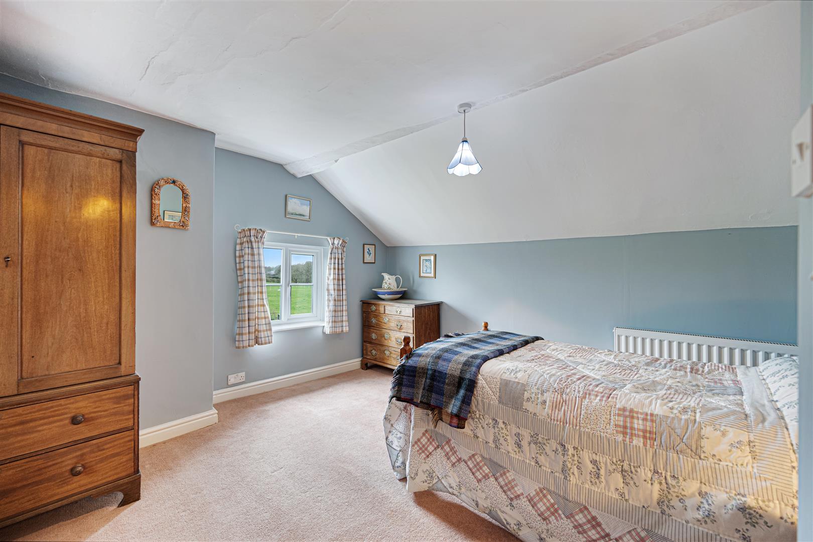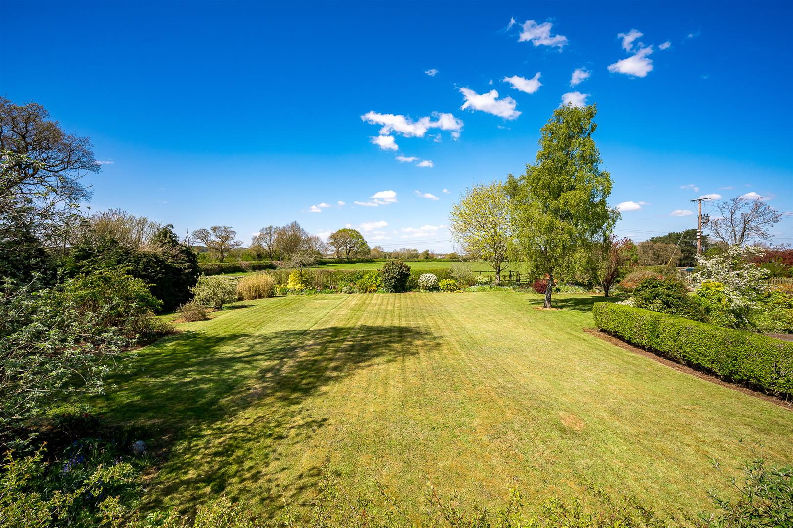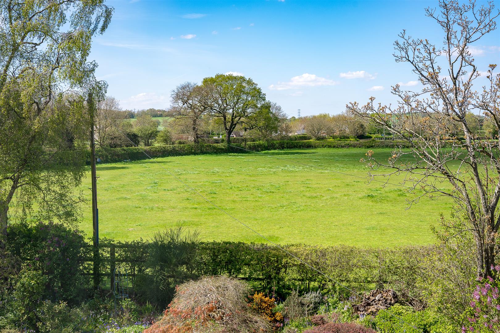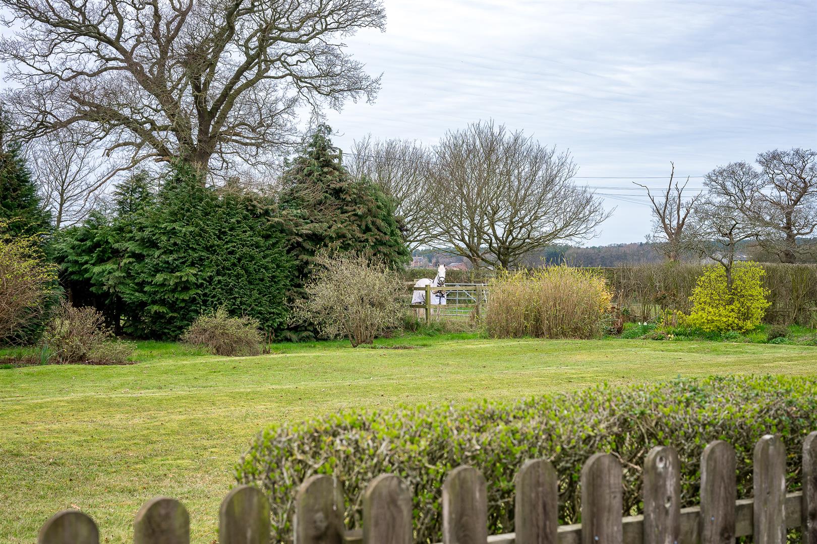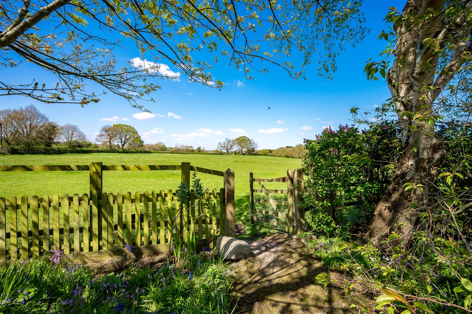 The gardens are a delight and a real feature of the house, being southwest facing, they wrap around the front and side elevations and consist of large expanses of manicured lawns punctured by mature specimen trees, shrubs and well stocked flower borders. There is a private stone terrace/al fresco dining area accessed off French doors from the sitting room, with far reaching views over the paddock land. There is a pretty wicket gate that leads from the gardens to the paddock land.
