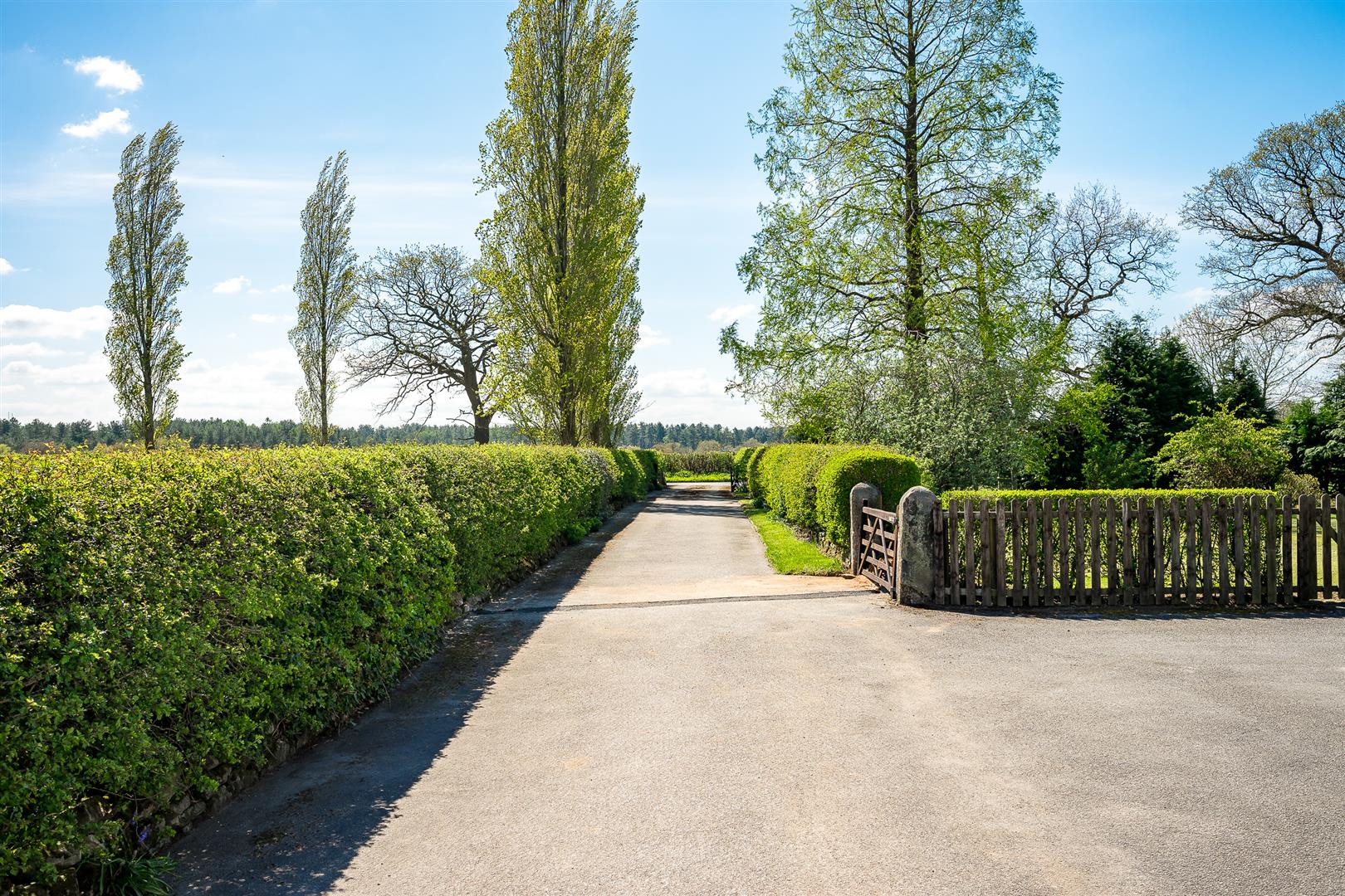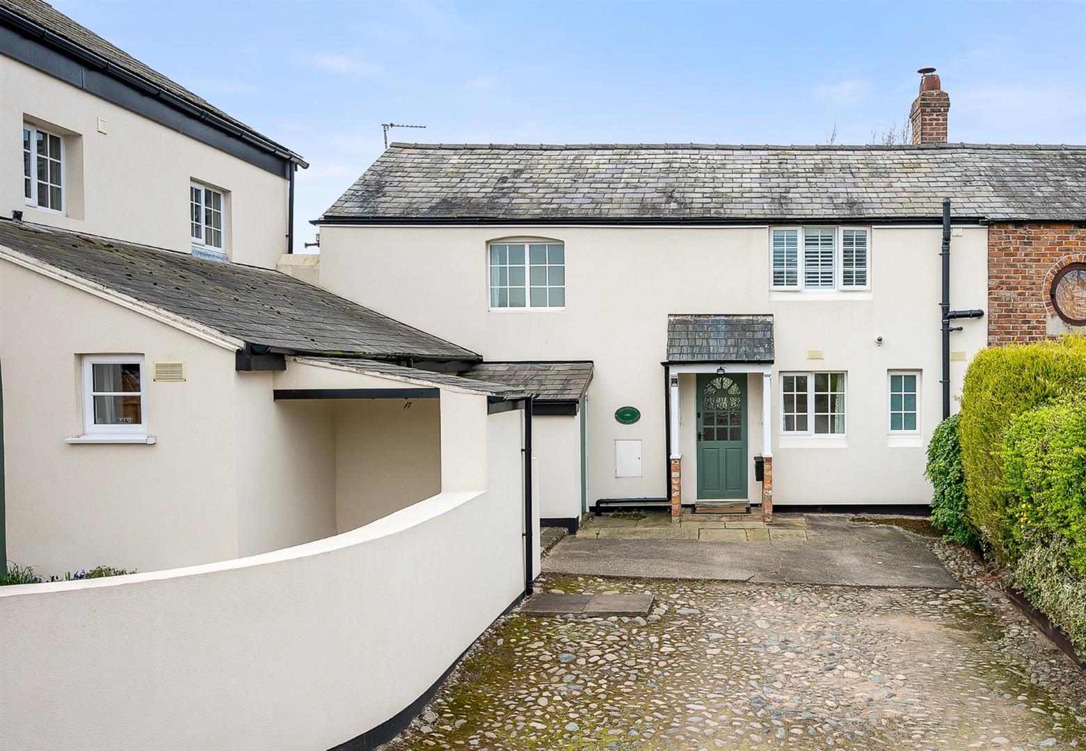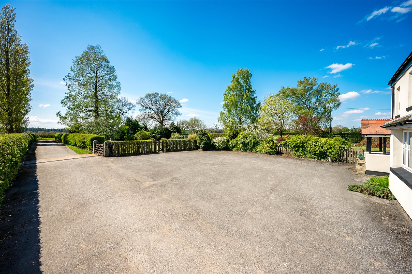 An impressive, gated entrance opens into a long hedge lined drive leading to a large parking and turning area for numerous cars, at the front of the house. The drive then continues past the side of the house to a further cobbled parking/turning area for the cottage.