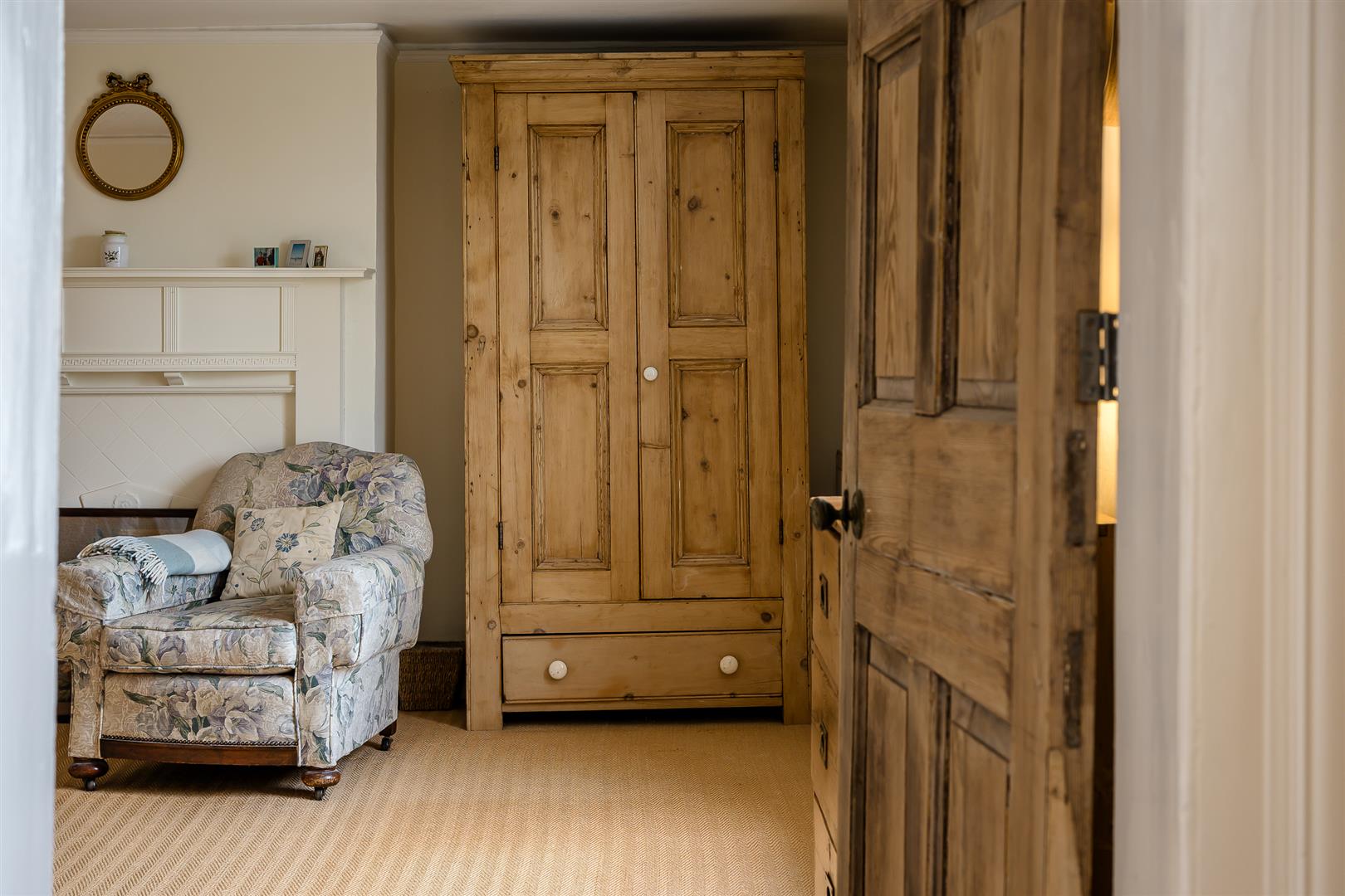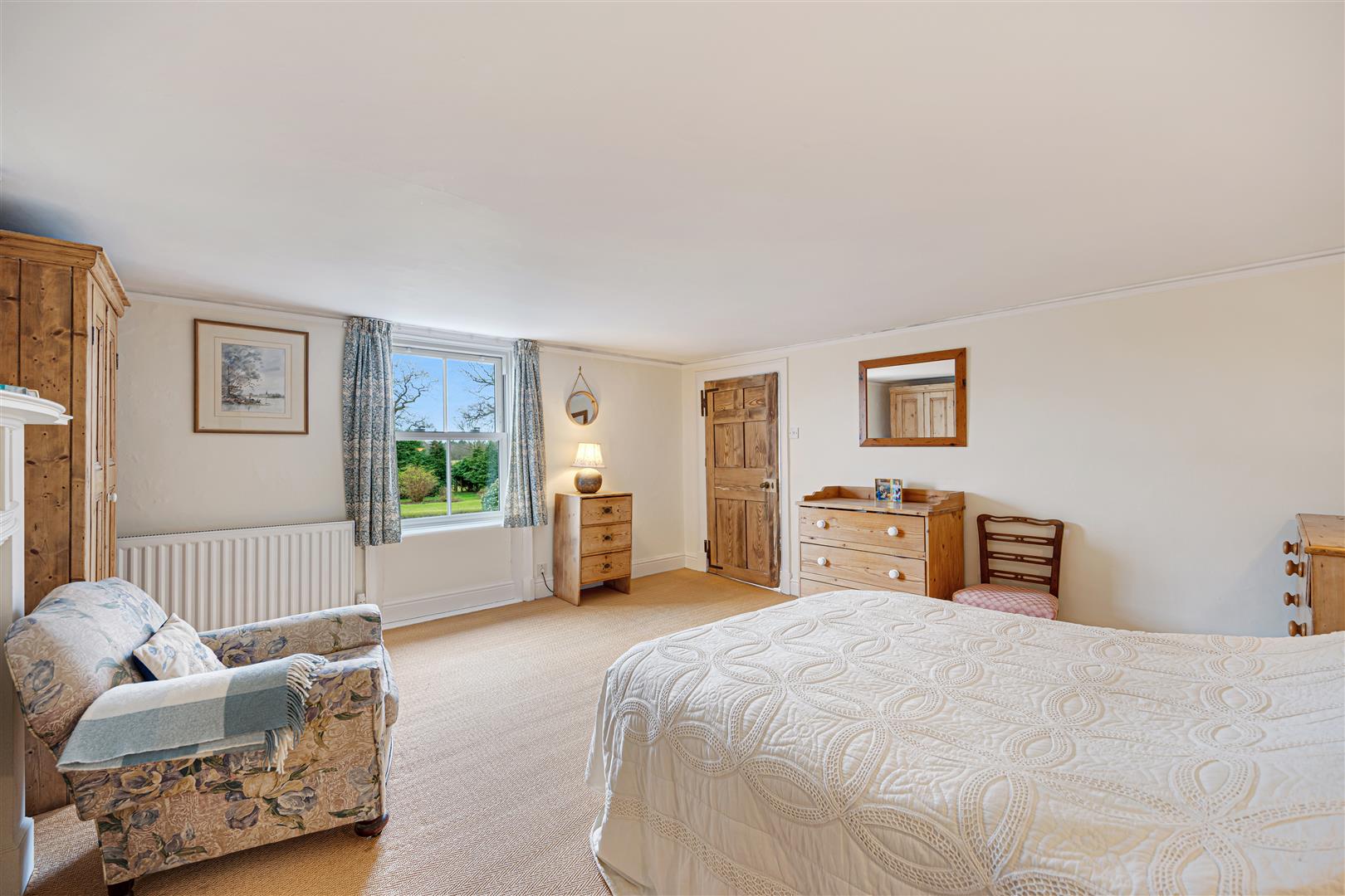 The lovely drawing room sits to the front of the house with open hob grate fireplace with wooden surround and walls with picture rail and cornice ceiling. The sitting room is equal in stature with wooden flooring, corniced ceiling, feature brick fireplace (blocked off) and French doors set into a bay window leading to the al fresco dining area. The sitting room is open plan to the large kitchen/breakfast room with attractive tiled flooring. The kitchen has a full range of hand painted solid wood bespoke wall and floor units with granite worksurface, a Rayburn set into a fireplace recess, ceramic sink, integral hob and electric cooker, dishwasher, fridge and freezer. There is room for a large kitchen table to the centre of the kitchen.