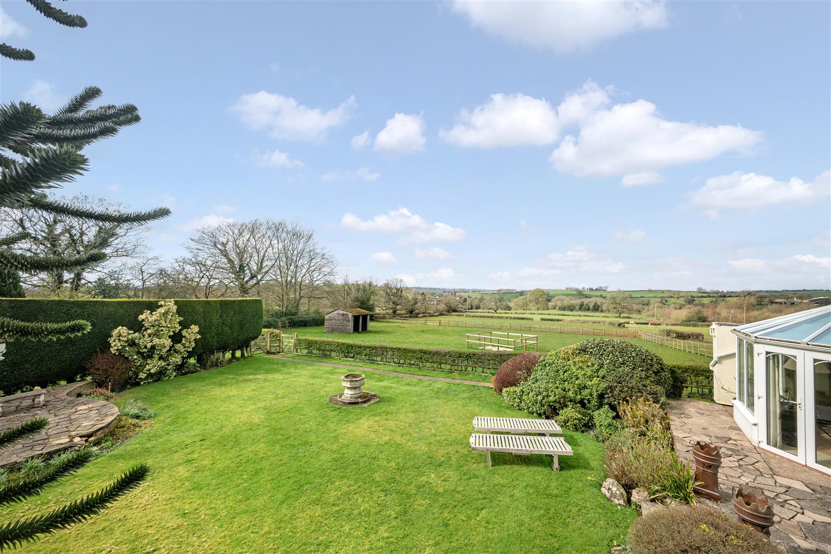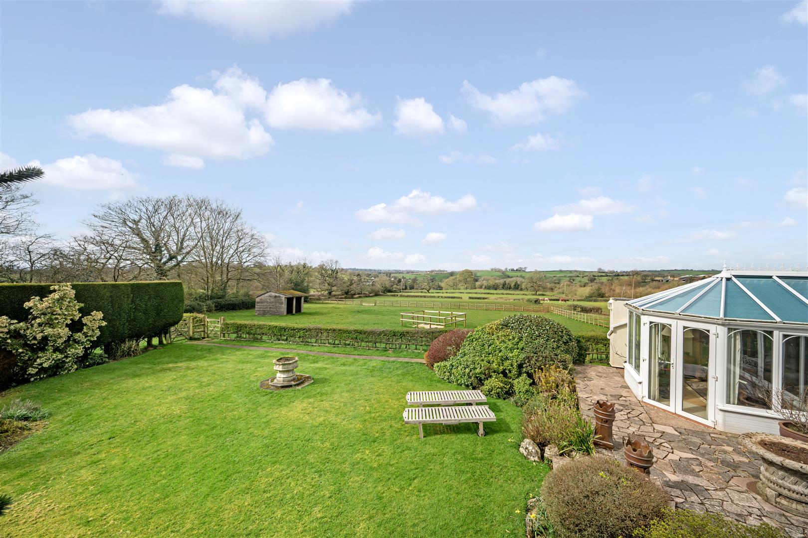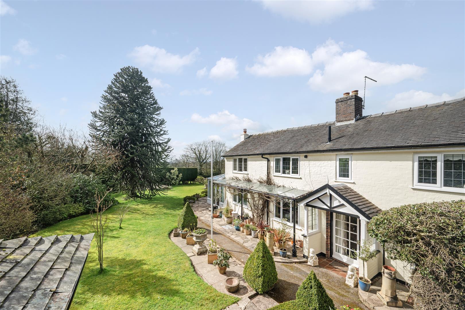 The level, manicured lawns wrap round the side of the house, where the lawns become more expansive. A wide stone terrace abuts the large garden room with access via two sets of French doors. This lovely terrace takes in the far-reaching views of the gardens and paddock land with the Bickerton and Peckforton hills providing the perfect backdrop. There is a further raised stone terrace overlooked by a large monkey puzzle tree. The lawns are interspersed with mature flower and shrub boarders with an opening through a high ever green hedge at the bottom of the lawns leading to secret garden area with redundant Greenhouse.