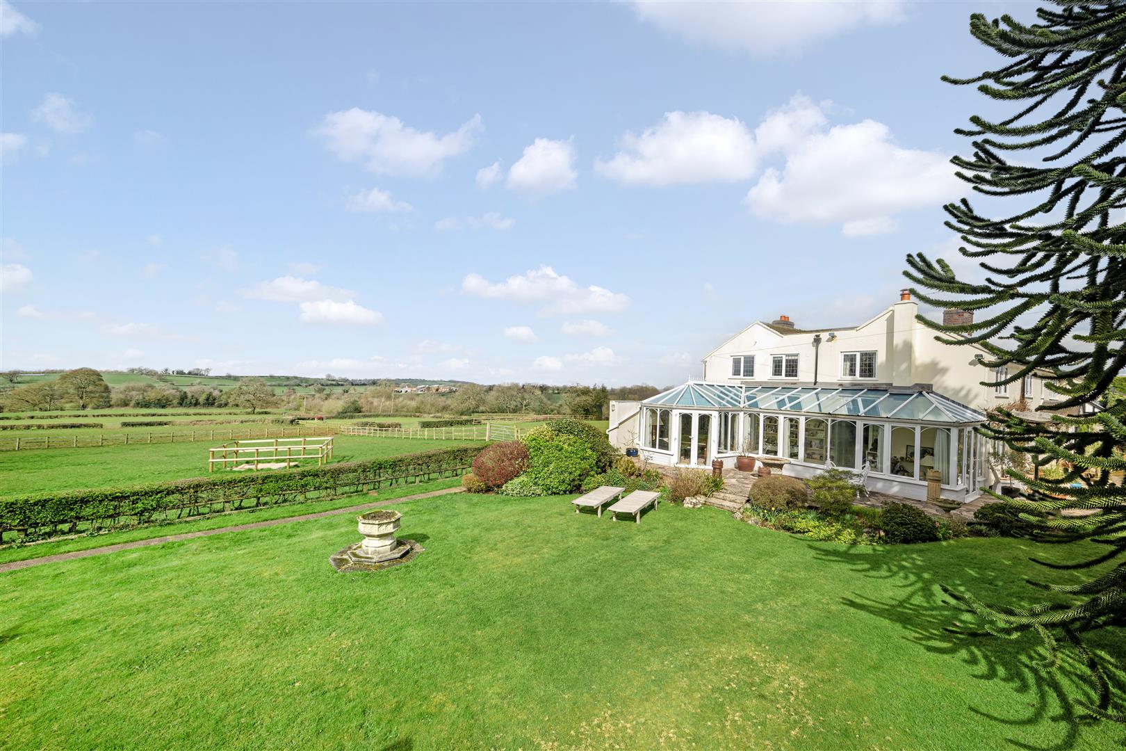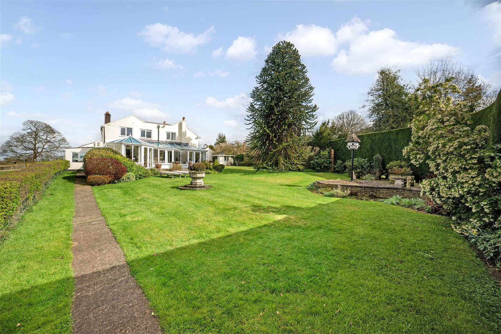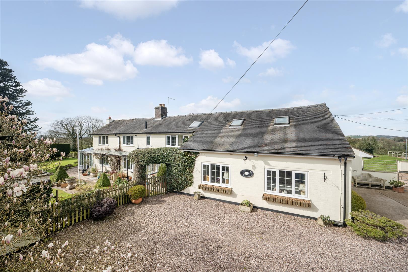 The level, manicured lawns wrap round the side of the house, where the lawns become more expansive. A wide stone terrace abuts the large garden room with access via two sets of French doors. This lovely terrace takes in the far-reaching views of the gardens and paddock land with the Bickerton and Peckforton hills providing the perfect backdrop. There is a further raised stone terrace overlooked by a large monkey puzzle tree. The lawns are interspersed with mature flower and shrub boarders with an opening through a high ever green hedge at the bottom of the lawns leading to secret garden area with redundant Greenhouse.