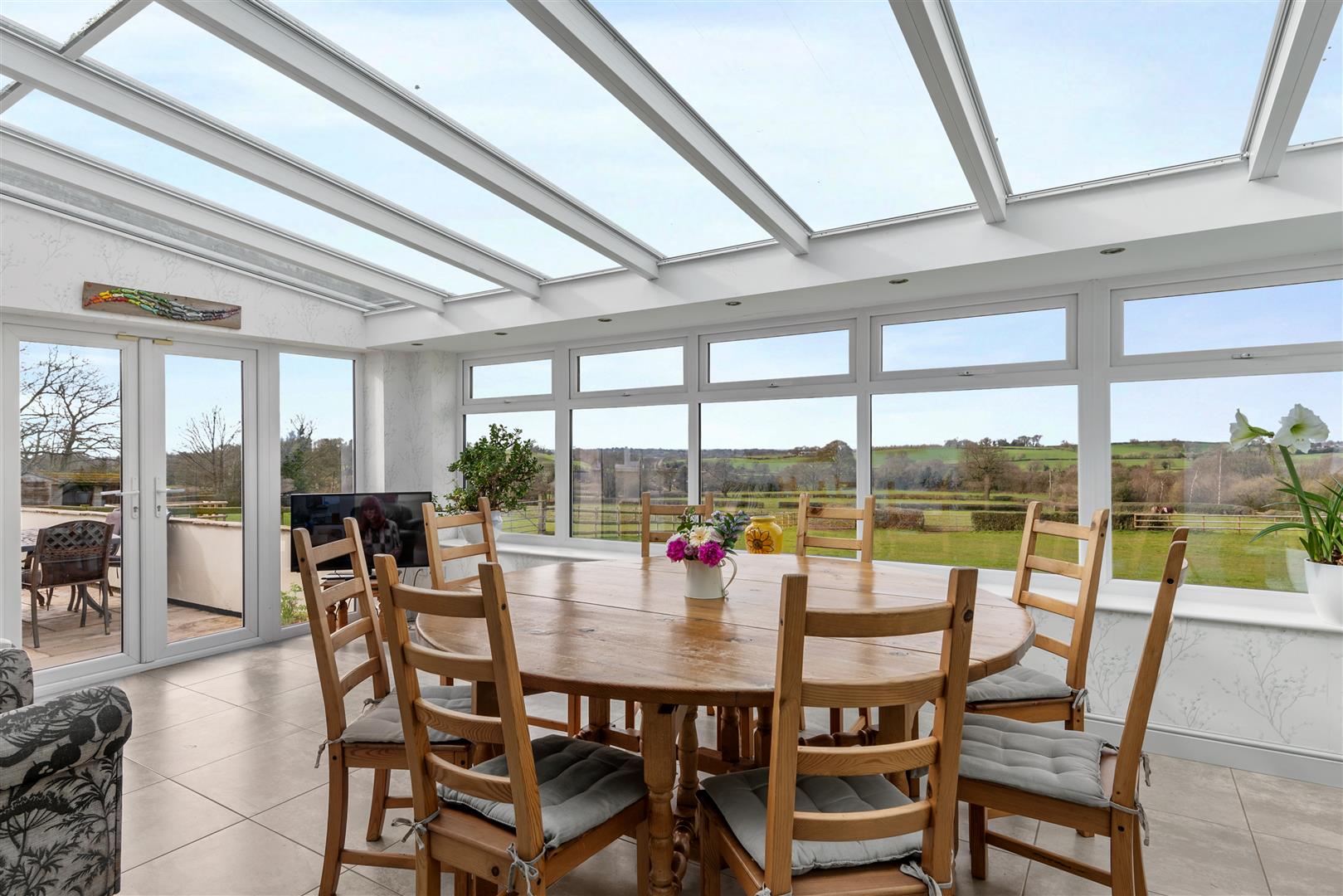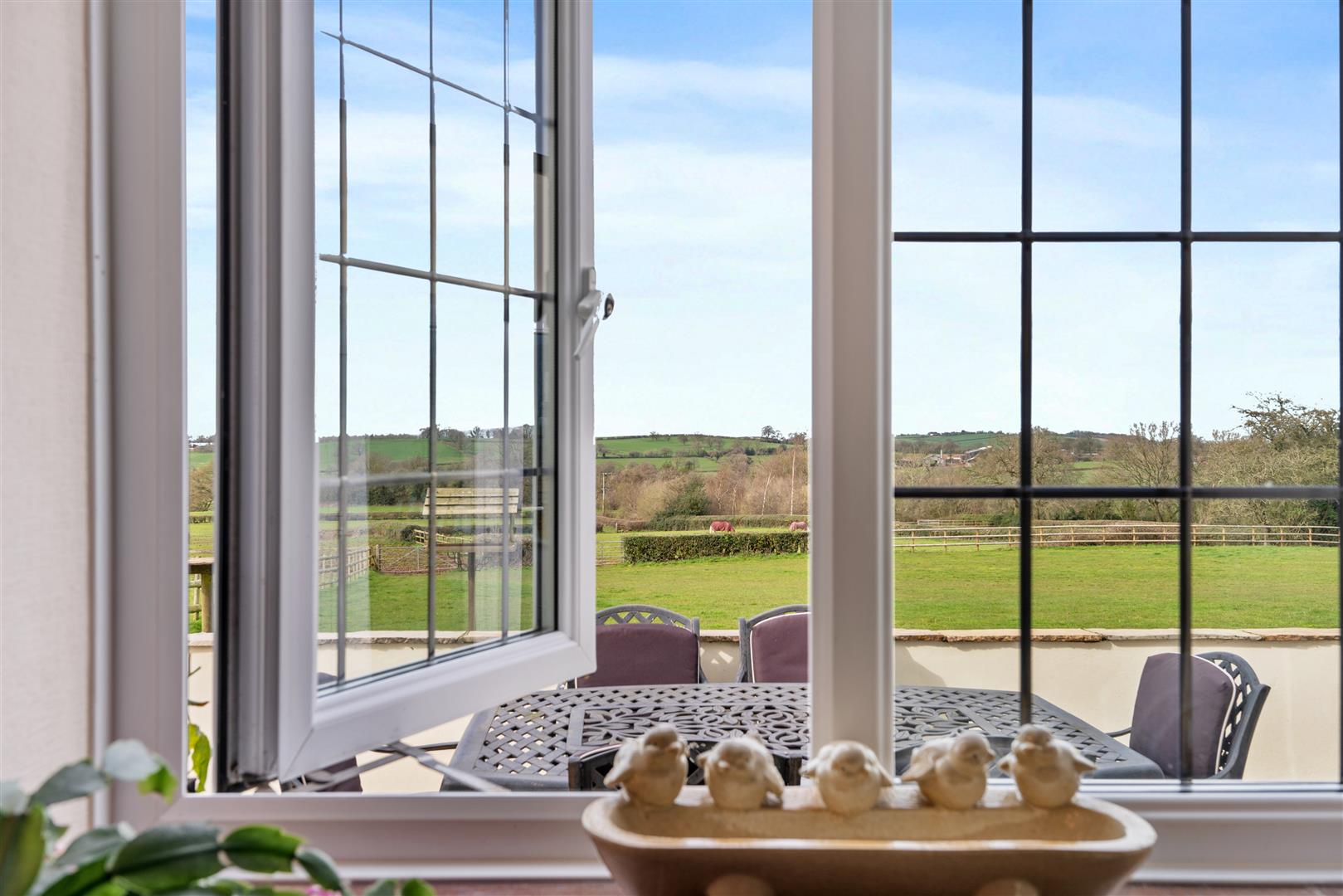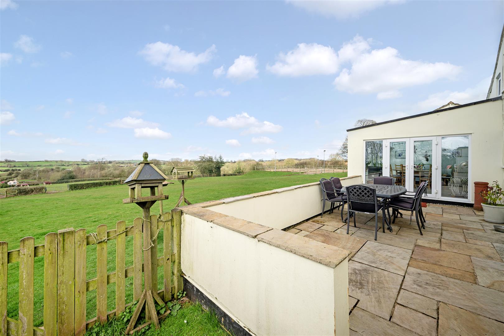 The gardens wrap around to the rear of the house to fully capitalise on the breathtaking rural views, with a further large stone and walled terrace adjoining the house, accessed via French doors off the Orangery. This area is an ideal for al fresco dining while taking in the breathtaking views. A wicket gate from the gardens leads to the paddock land for ease.