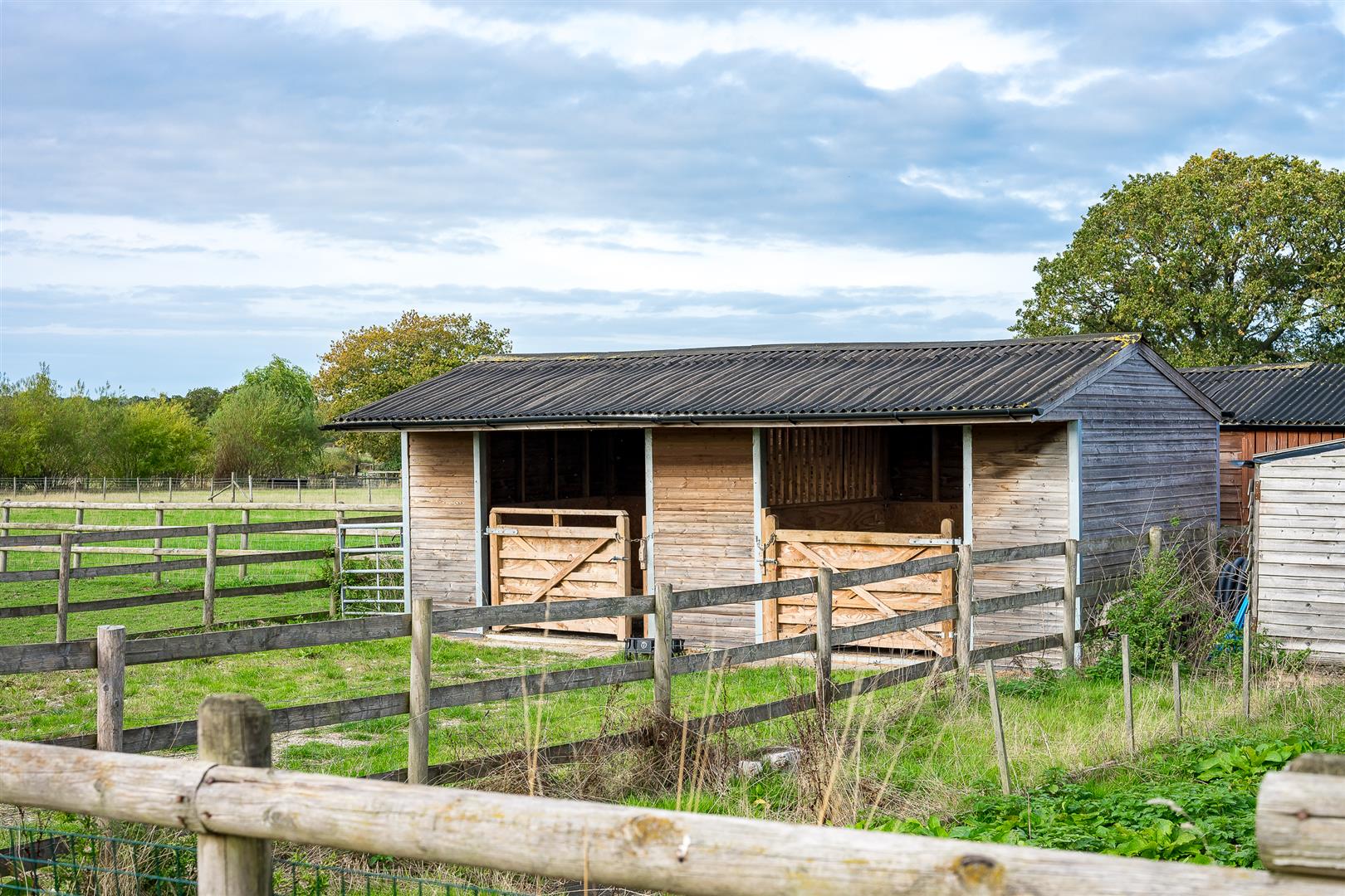 Beyond the gardens are the equestrian facilities, which include a range of concrete block and timber buildings containing a large workshop, tack room, feed room and open sided store. There are 5 stables in total, plus two well positioned field shelters with winter turnout paddocks.