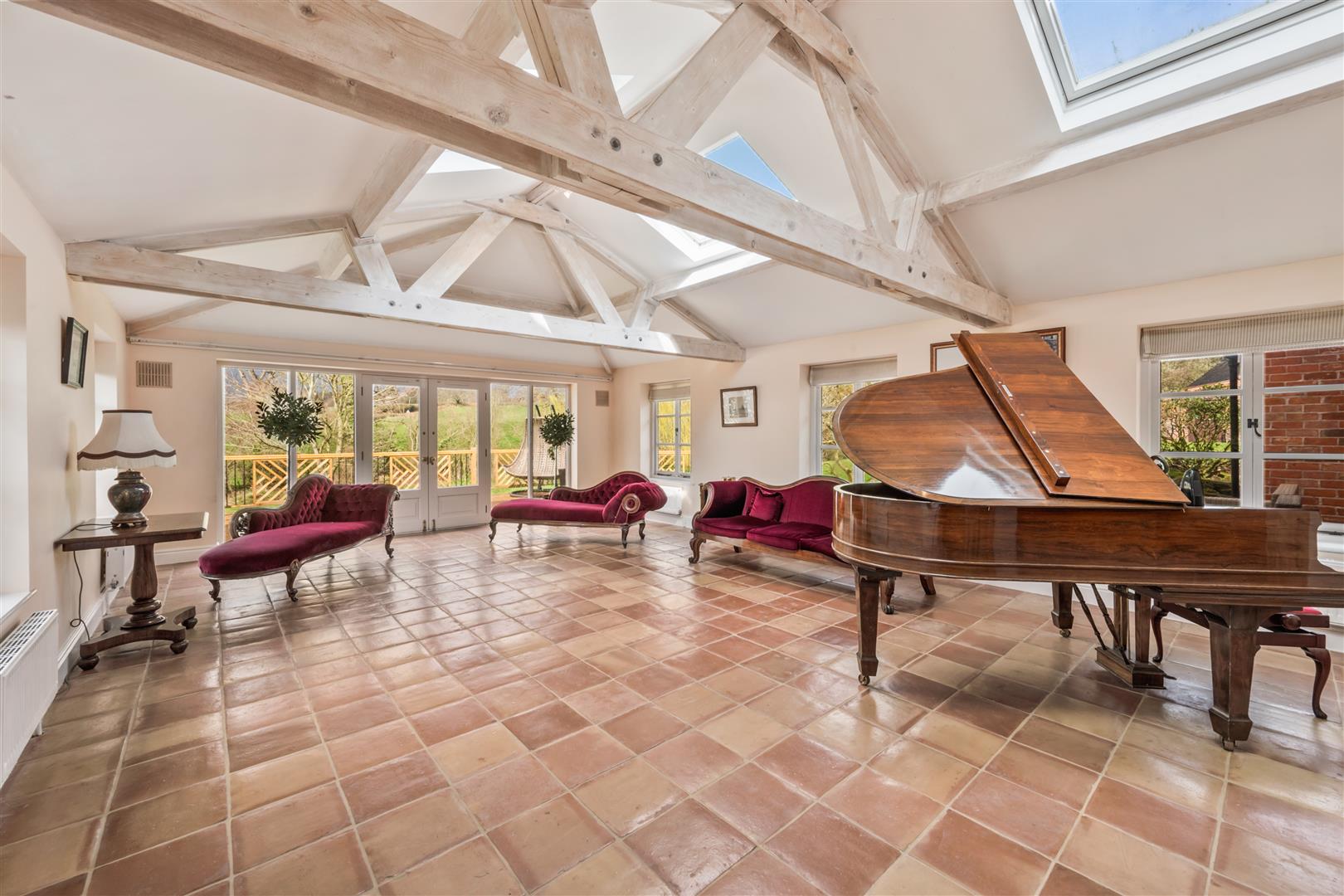 A well-appointed family room provides extensive built-in storage, a spiral staircase to the first floor, and open access to both the kitchen and the bright dining room. The latter is a standout space with vaulted ceilings, exposed beams, and French doors opening onto the decked area and landscaped gardens.
