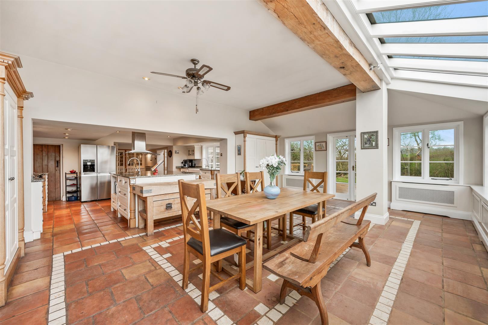The farmhouse opens via a solid oak door into an Entrance Hall with slate flooring, leading through to a characterful reception hall featuring exposed timbers, quarry tiles, an open