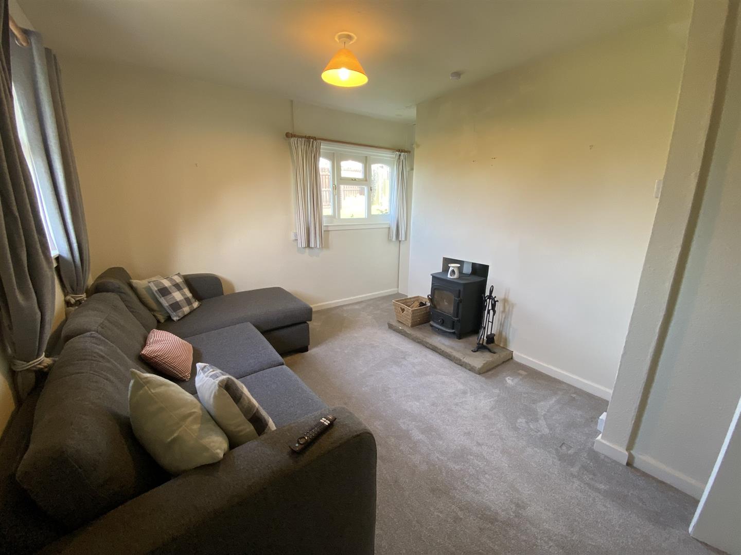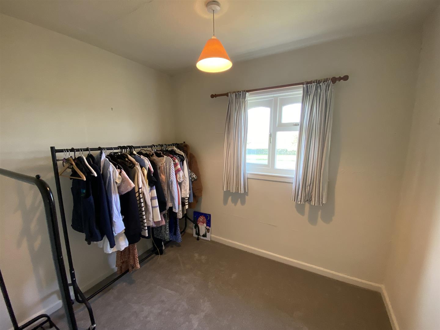An inner hallway provides access to the living room, which features a Clearview log-burning stove and enjoys views across the paddocks. The property offers a double bedroom with a fitted storage cupboard, alongside a versatile second room suitable for use as a single bedroom, dressing room, or home office. The bathroom is fitted with an electric shower over the bath.