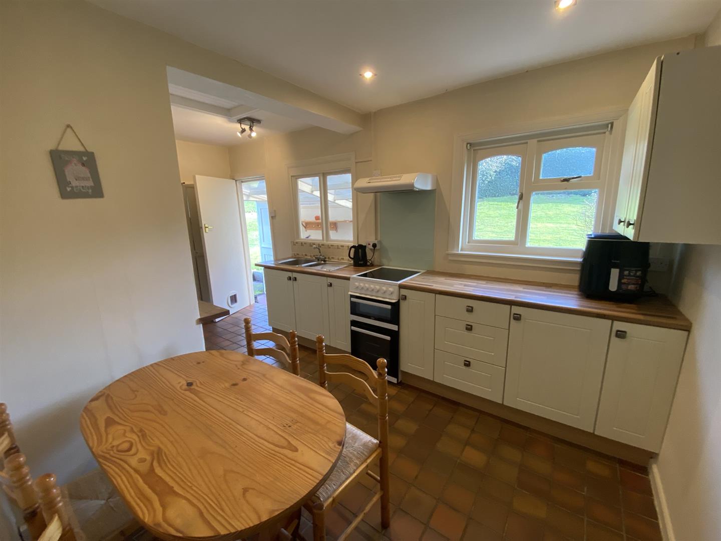 The accommodation is entered via a practical utility/boot room, leading into a well-appointed kitchen fitted with a range of base and wall-mounted units, a freestanding electric cooker, and a useful pantry cupboard. There is space for a small dining table, and the kitchen benefits from a traditional quarry tiled floor.