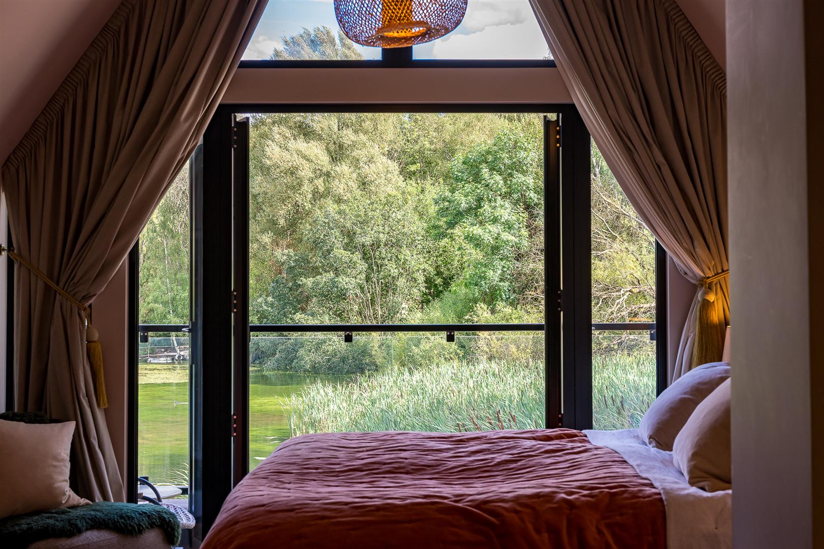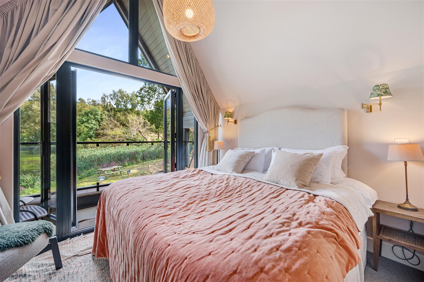 To the first floor, three double bedrooms are well served by a family bathroom with bathtub and shower over, all neutrally decorated with bespoke fitted blinds. The principal bedroom is spectacular. Split level and with a vaulted ceiling, the suite boasts a private balcony overlooking the lake and a Moroccan inspired ensuite split by a spacious dressing area.