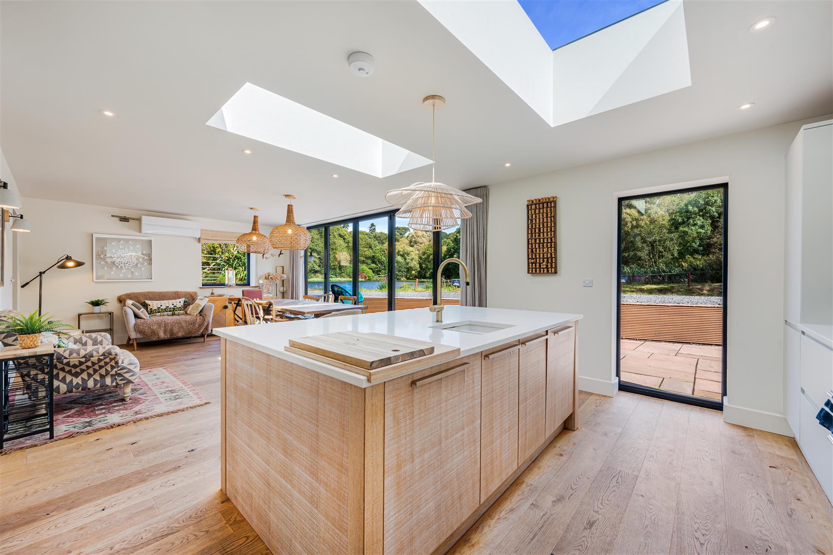 At the heart of the home lies a beautifully appointed kitchen, centred around a substantial island topped with quartz worktop and featuring an inset sink and space for casual seating — ideal for both everyday family life and social gatherings. Thoughtfully designed, the kitchen includes integrated appliances including dishwasher, fridge freezer and larder drawers alongside a freestanding Rangemaster cooker. Framing uninterrupted views of the lake and the woodland beyond, full-length bifold doors open onto a stylish alfresco dining patio, flooding the dining area with natural light and creating a truly unique backdrop for entertaining.