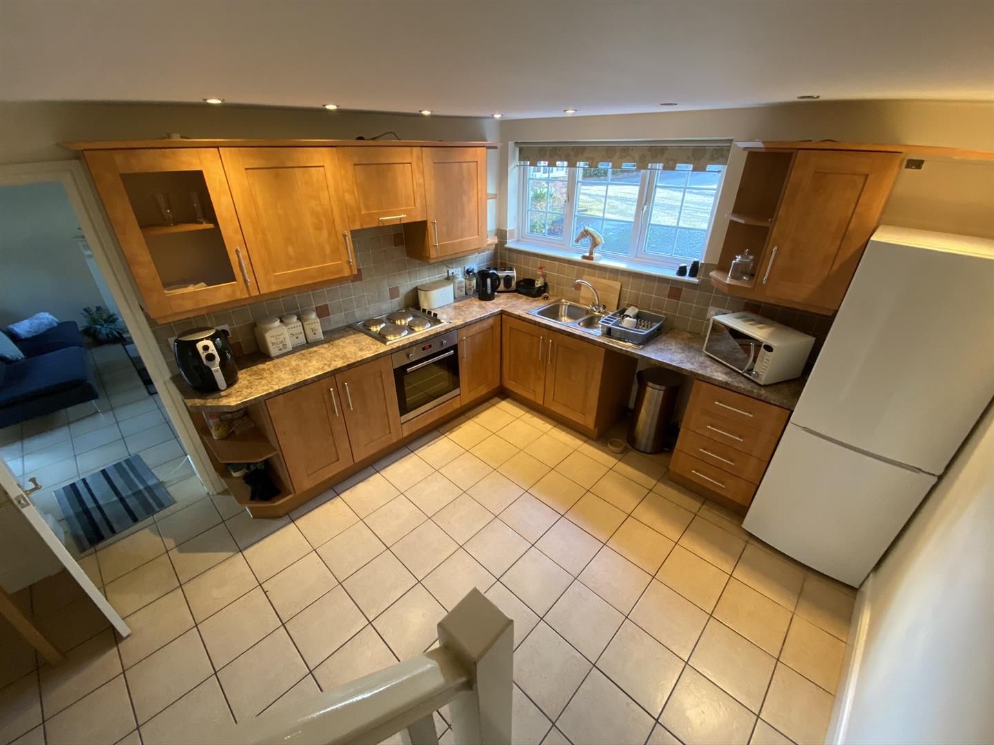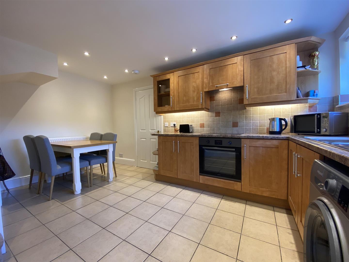The front door leads into the living room having tiled floor which continues through to the kitchen. The living room has a central fireplace with electric fire and double patio doors which lead off to the rear courtyard. The kitchen is modern in design, having an integrated oven and electric four ring hob with fitted base and wall mounted units, there is also space for a washing machine. There is an under stairs store where the central heating oil fired boiler is housed.